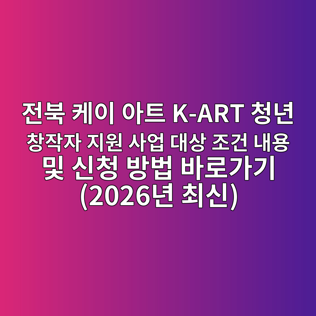 전북 케이 아트 k-art 청년 창작자 지원 사업 신청 조건 대상 내용에 대해서 알아보고 계신가요? 이번 포스트에서는 전북 케이 아트 k-art 청년 창작자 지원 사업 신청 방법에 대해서 알려드리도록 하겠습니다.전라북도에서 예술과 창작의 꿈을 키워나가는 청년 여러분, 2026년 전북 케이 아트 K-ART 청년 창작자 지원 사업은 여러분의 열정을 현실로 만들 소중한 기회가 될 것입니다. 이 사업은 전라북도 지역 내 청년 예술가와 창작자들이 경제적인 부담 없이 창작 활동에 전념하고, 나아가 지역 문화예술 발전에 기여할 수 있도록 돕기 위해 마련되었습니다. 예술 분야의 재능과 잠재력을 가진 청년이라면 누구나 주목해야 할 이 지원 사업에 대해 상세히 알아보겠습니다. 본 가이드는 사업의 기본 개요부터 신청 방법, 성공적인 지원을 위한 팁까지, 여러분이 궁금해할 모든 것을 담아 실질적인 도움을 드릴 것입니다.